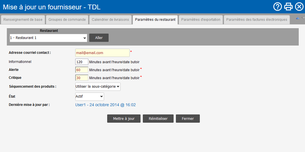Les Paramètres du restaurant vous permettent de définir des alertes pour les heures limites de passage des commandes, déterminer l’affichage par défaut des produits lors de la création du bon de commande, et activer/désactiver le fournisseur pour des restaurants en particulier.