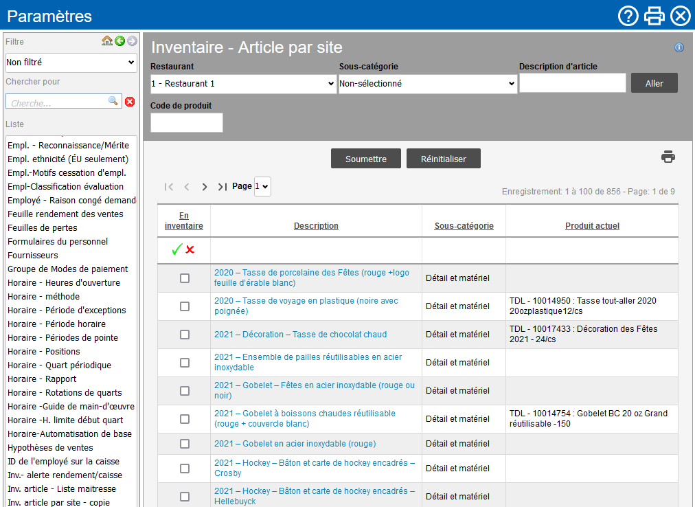 Inventaire - Article par site est l'endroit où les restaurants peuvent indiquer quels articles sont tenus par leur restaurant et lesquels ne le sont pas. La liste comprend tous les articles marqués comme Actifs dans la Inv. article - Liste maitresse. Les articles marqués comme En inventaire sur la page Inventaire - Article par site peuvent être ajoutés aux feuilles d'inventaire, transférés vers/depuis d'autres restaurants, etc. Utilisez ce paramètre pour activer et désactiver des articles d’inventaire pour des restaurants individuels dans votre organisation.